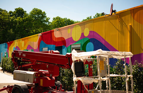 Auf der Fassade entstand ein großes mehrteiliges Fassadenbild aus bunten, geschwungenen Formen.