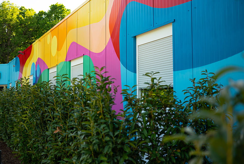 Durch den Einsatz von kinder- und familienfreundlicher Kunst hat die Halle von Außen einen einzigartigen und einladenden Charakter bekommen.