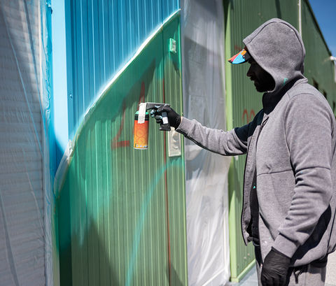 Im Mai 2025 bemalte Sebastian die gesamte Fassadenfront des Erlebnis- und Spielparadieses Flippolino in Kirchen (Sieg).